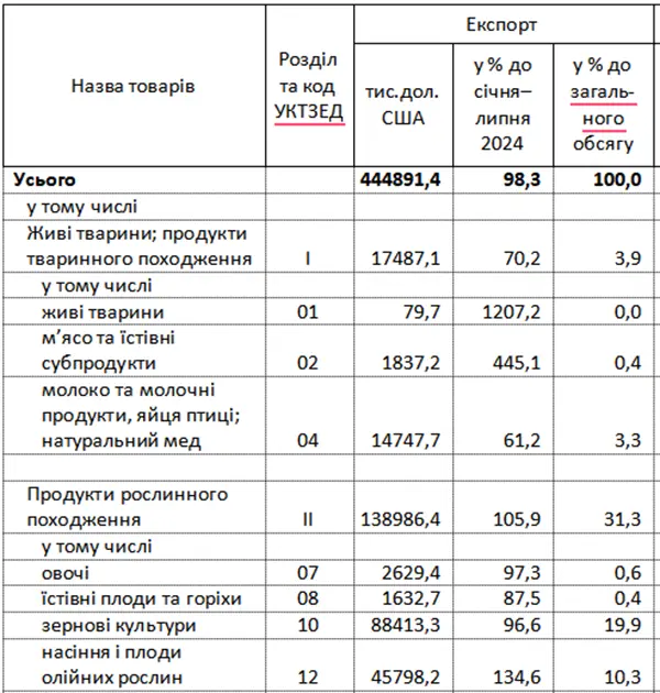 Натомість дещо зросла частка товарів з групи “жири та олії тваринного або рослинного походження”: вона сягнула 11,7% або 52,2 мільйона. Зростання порівняно із січнем-липнем минулого року – на 1,2%.