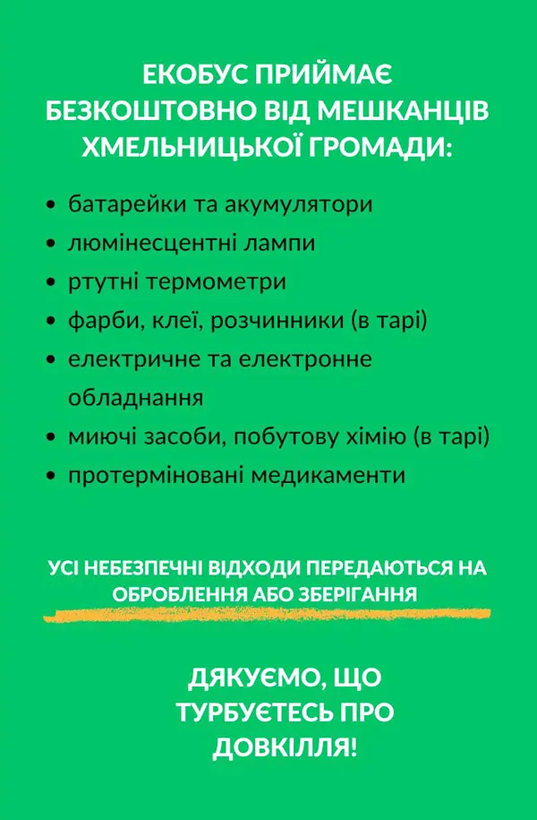 Небезпечні відходи також можна здати у Центри управління відходами (проспект Миру, 7) та перетин вул. Чорновола та Пілотської щоденно з 8:00 по 19:00, – нагадали в Офісі “Розумне довкілля. Хмельницький”.