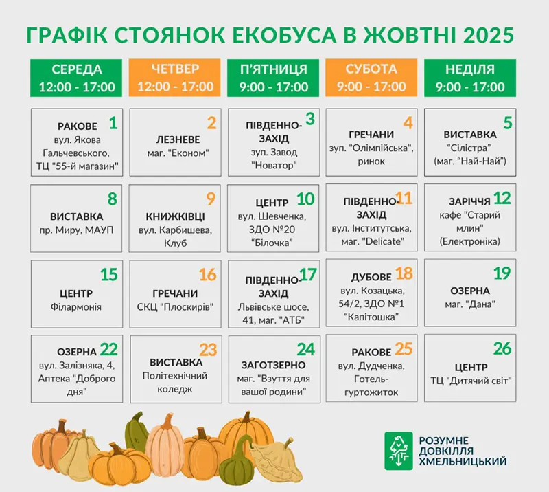Протягом наступного місяця екобус матиме на території Хмельницької громади 20 стоянок в різних мікрорайонах обласного центру.
