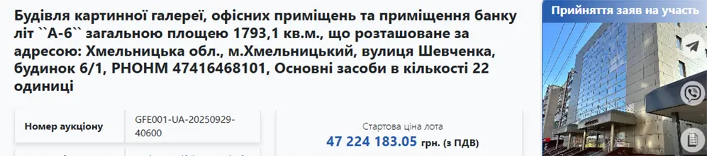 Пропозиції на тендер «Будівля картинної галереї, офісних приміщень та приміщення банку літ «А-6» загальною площею 1793,1 кв. м, що розташоване за адресою: Хмельницька обл., м. Хмельницький, вулиця Шевченка, будинок 6/1, РНОНМ 47416468101. Основні засоби в кількості 22 одиниці» можна подавати до 21 жовтня. Аукціон відбудеться 22 жовтня о 12:35.