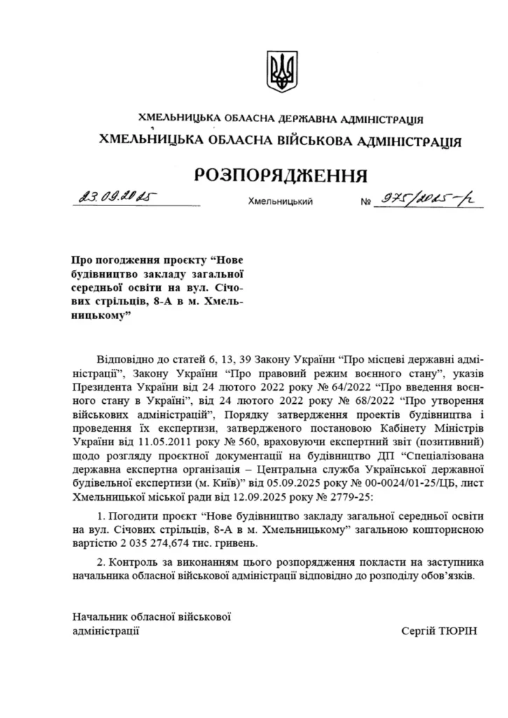 Поки що маємо з офіційно підтвердженого – розпорядження начальника Хмельницької ОВА від 23 вересня “Про погодження проєкту “Нове будівництво закладу загальної середньої освіти на вул. Січових стрільців, 8-А в м. Хмельницькому”.