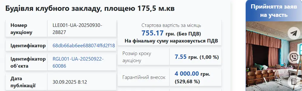Як йдеться на сайті Української універсальної біржі, замовник торгів – відділ культури, національностей, релігії та туризму Старосинявської селищної ради, що на Хмельниччині. Початкова ціна – 755,17 гривні без ПДВ. Розмір мінімального кроку аукціону – 7,55 гривні або 1% вартості.