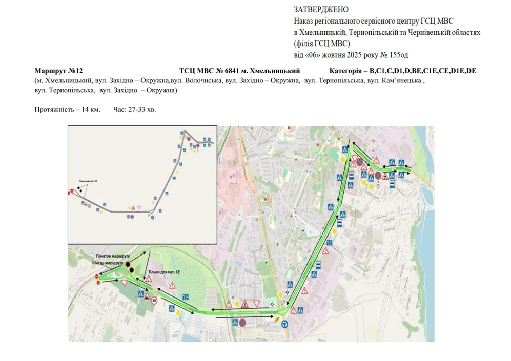 м. Хмельницький: з 11 маршрутів стало 12. Новий – 12-й маршрут – передбачений для складання іспитів на категорії С та С1, що дозволяє водіям вантажних транспортних засобів якісно відпрацювати необхідні навички керування великогабаритною технікою в умовах, максимально наближених до реальних дорожніх ситуацій.