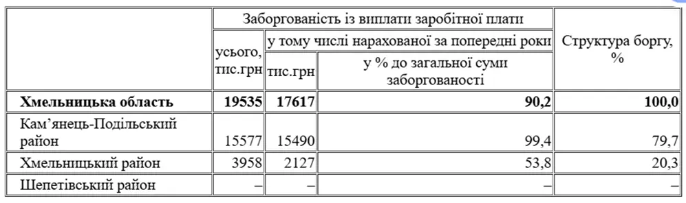 У Хмельницькому районі завинили працівникам майже чотири мільйони (на 1 вересня 2021-го – 4,15 мільйона). У Шепетівському районі заборгованості наразі немає (була 1,1 мільйона). В Кам’янець-Подільському районі не виплатили 79,7% загального боргу, у Хмельницькому – 20,3%.