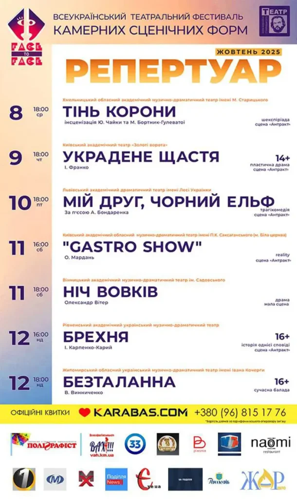 Нагадаємо, що з 8 по 12 жовтня Хмельницький створює для поціновувачів театру надзвичайну подію – бієнале камерного театрального мистецтва – фестиваль «Face to face». Всі п’ять днів фестивалю спраглі театрали можуть, як то кажуть, втамувати душу подорожуючі камерним театральним мистецтвом Хмельницького, Києва, Житомира, Львова, Вінниці та Рівного.