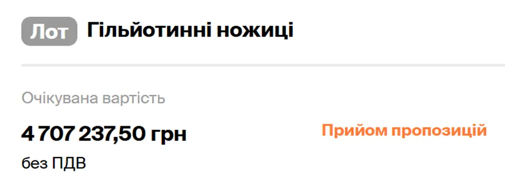 Пропозиції на тендер «Гільйотинні ножиці» можна подавати до 20 жовтня. Аукціон відбудеться 21 жовтня в 12:35.