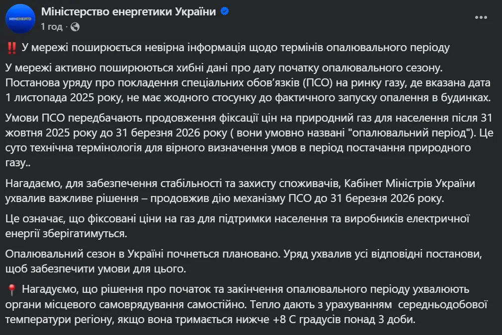 Спростували інформацію, що поширюється у соцмережах та ЗМІ, у Міністерстві енергетики України, зазначивши, що “Постанова уряду… де вказана дата 1 листопада 2025 року, не має жодного стосунку до фактичного запуску опалення в будинках“.