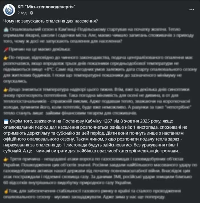 Останні кілька днів у соцмережах та у деяких ЗМІ поширюють інформацію про те, що нібито Кабмін прийняв постанову, згідно з якою початок опалювального сезону в Україні, відповідно, і на Хмельниччині також, переноситься на 1 листопада. Також споживачів “лякають” тим, що якщо опалювальний сезон у якихось громадах почнеться раніше, то люди не отримають субсидії на оплату отриманих послуг. Навіть в одному з комунальних підприємств Хмельниччини офіційно послалися на документ, який нібито підтверджує цю інформацію. Однак у Міністерстві енергетики це спростували.