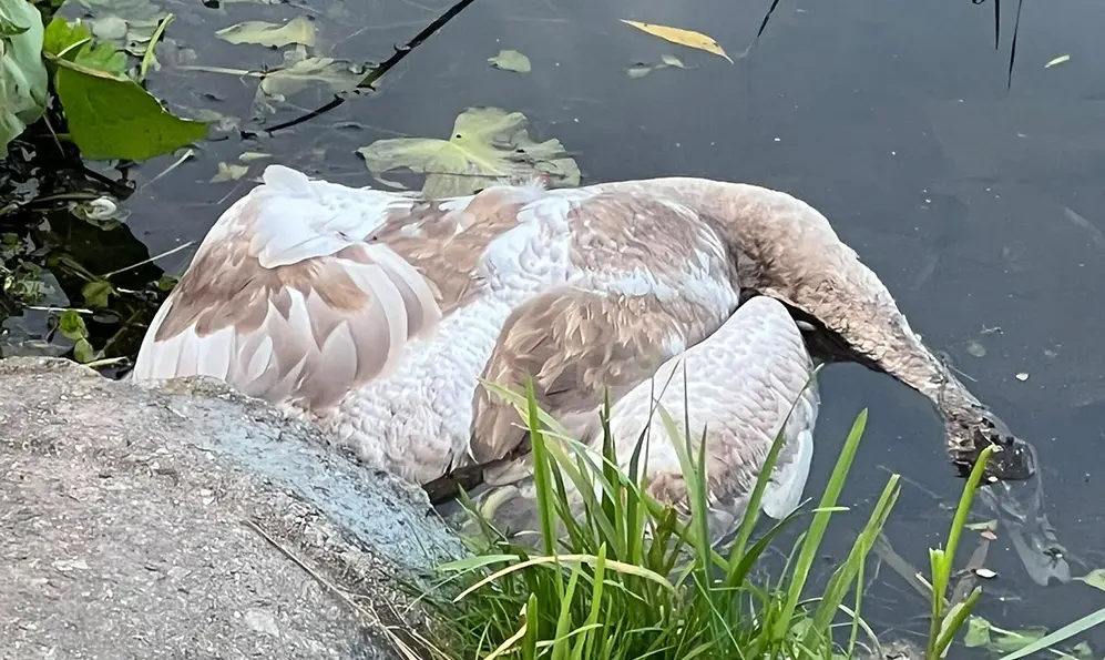 Лебідь так і лежить біля берега. Мертвий