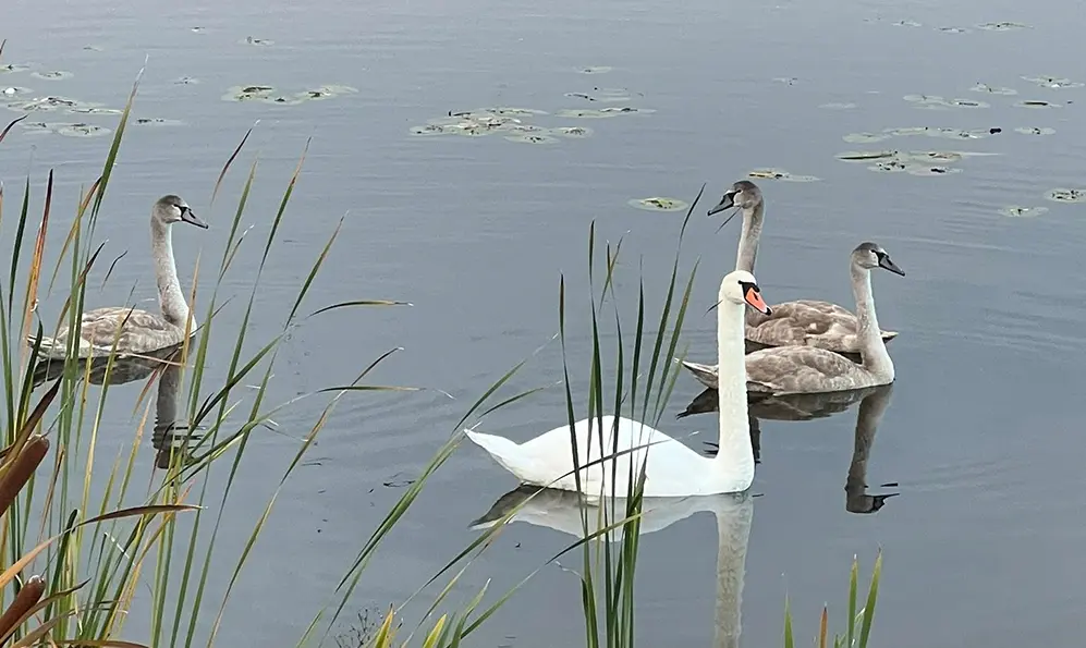 На набережній загинув молодий лебідь біля стічної труби. Родина шукає, плавають поруч, кличуть, – йдеться у коментарі до оприлюднених фото.