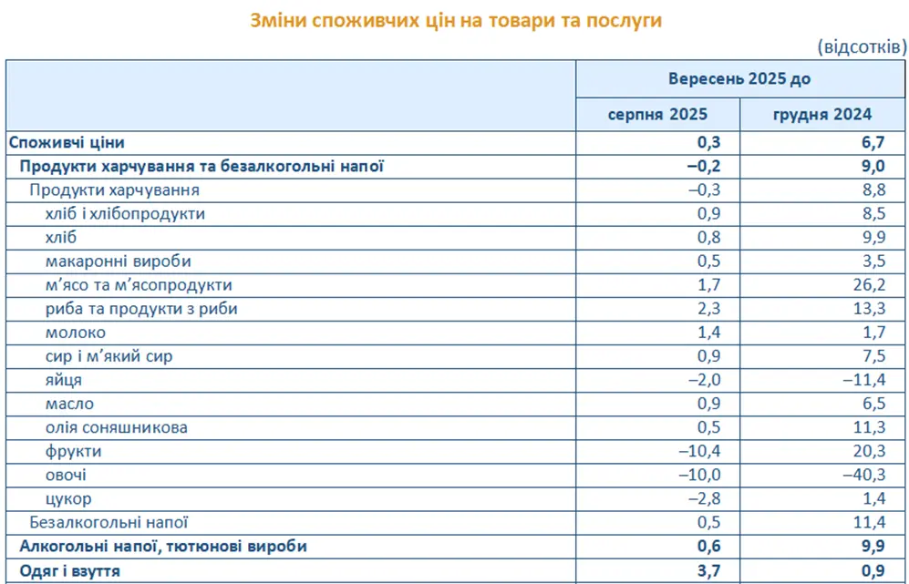 Водночас на 6,5–0,5% підвищились ціни на яловичину, рибу та продукти з риби, маргарин, свинину, кисломолочну продукцію, продукти перероблення зернових, молоко, сало, сметану, кондитерські вироби з борошна, кондитерські вироби з цукру тощо.