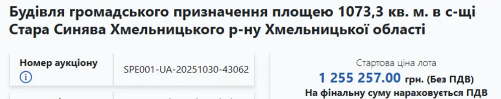 Пропозиції на тендер «Будівля громадського призначення площею 1073,3 кв. м в селищі Стара Синява Хмельницького р-ну Хмельницької області» можна подавати до 6 листопада. Аукціон відбудеться 7 листопада о 12:35.