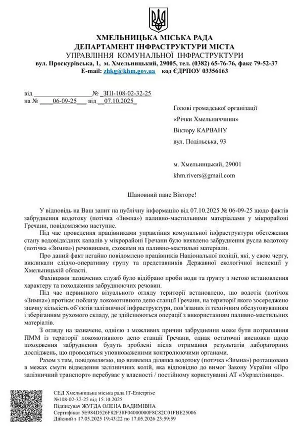 Наслідки екологічного лиха у місті Хмельницькому в Дальніх Гречанах по забрудненню одного із притоків річки Південний Буг – струмка “Зимна”, що стались ще у середині вересня 2025 року, станом на 1 листопада 2025 року ніхто так і не ліквідовував. Ні винуватець, ні жодна із комунальних структур Хмельницької міської ради. Забруднення продовжує по потічку проходити разом із водою у русло Південного Бугу.